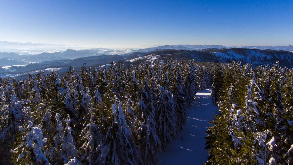 Widok z wieży na Radziejowej w zimie.